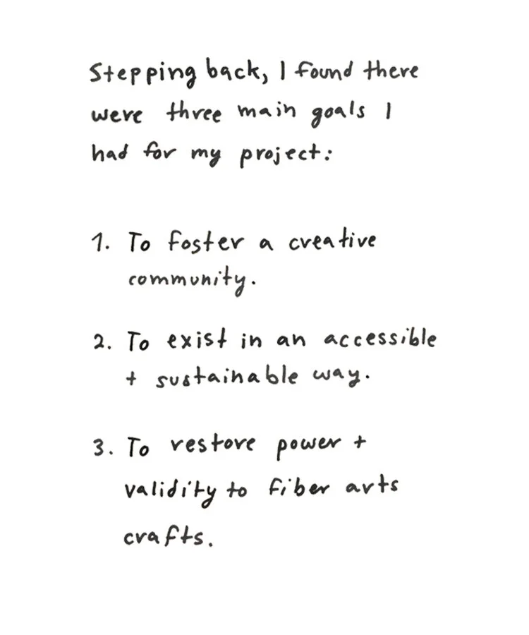 Workshops were the perfect vehicle to create a community where people could come together and inspire one another, stretch and develop their creative skillsets, and learn a reverence for craft. By teaching various fiber arts techniques, I could highlighting them as expansive, versatile platforms for anyone’s creative expression. The workshops would be free, with a suggested donation of $5, and all materials sourced second hand or donated.